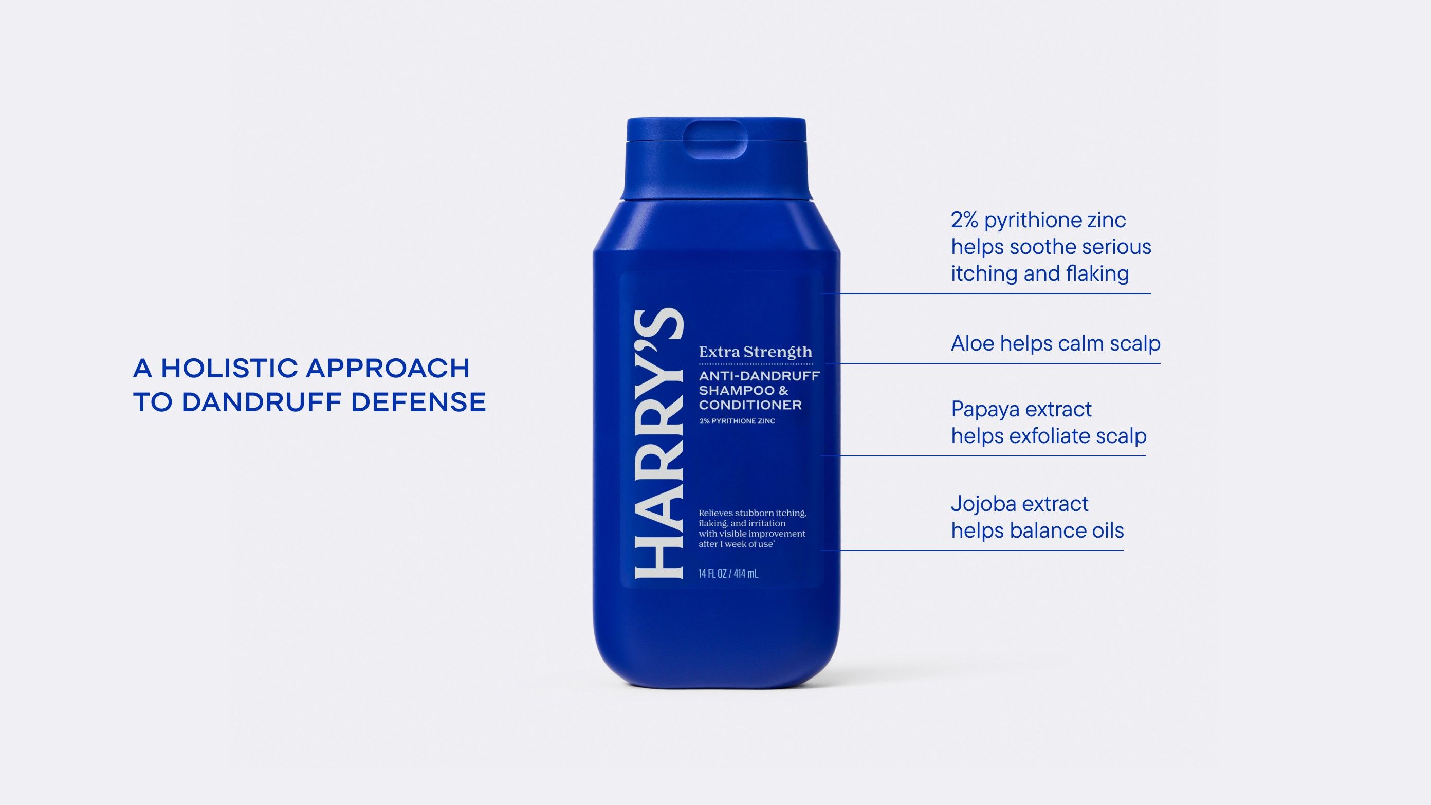 Blue bottle of Harry's anti-dandruff shampoo with text on a white background