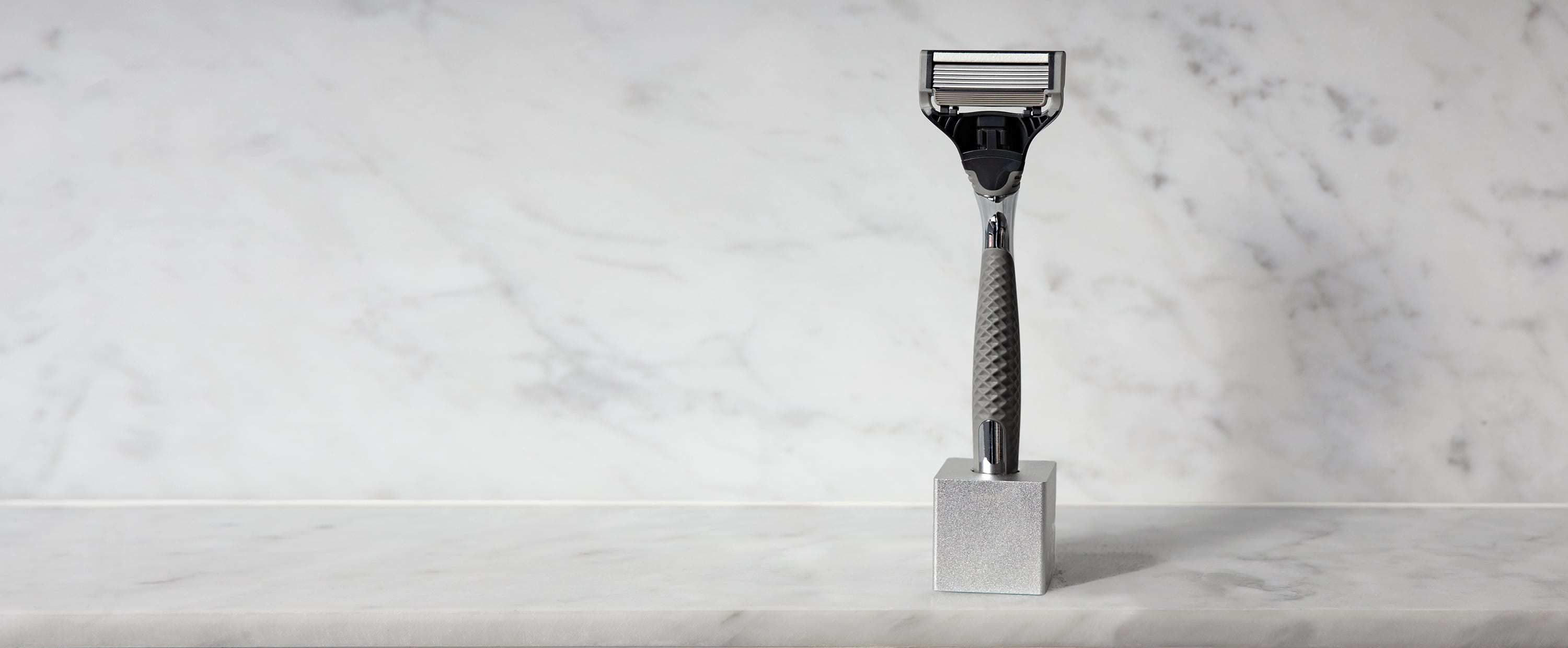 • Keeps your razor upright and dry, which helps the blades stay sharp longer